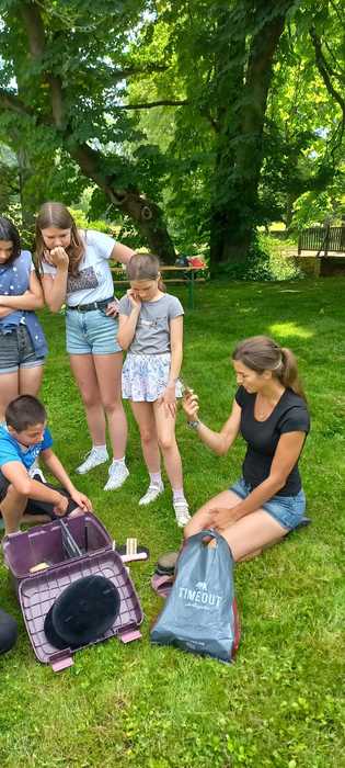 Dne 25. 6. 2023 prožily děti z našeho domova v Budkově krásný den, za který vděčí paní Laštovičkové a jejím přátelům. Připravili pro ně dětský den v parku s krásným programem. Děti si mohly zasoutěžit ve třech disciplínách, u kterých asistovali nejen naše tety z DD, ale i Petra Hájková. Následně se mohly vyřádit na nafukovacím hradu se skluzavkami, a toho také patřičně využily. Tady dohlížel pan Pavel Hladký a Jaroslav Hradecký. Velké oblibě se těšil i krásný kůň jménem Nip, který byl tak hodný a vozil děti pod vedením své jezdkyně po parku. I on vypadal spokojeně a velmi mu chutnala naše zámecká tráva. Děti vyplňovaly kvíz, který se týkal informací o koních, a překvapilo nás, kolik si toho děti zapamatovaly. Během vyplňování kvízu byly občerstveny zmrzlinou. Nejen pro děvčata byla po celou dobu k dispozici i studující kadeřnice Aneta Hájková, která jim zaplétala různé copy dle jejich přání. Paní Laštovičková dětem zajistila i pitný režim, myslela na všechno. Ten zajišťovali Jakub a Matěj Laštovičkovi. Den zakončili s dětmi opékáním vuřtů, povídáním si s nimi, také dostaly diplom za absolvování dětského dne, atmosféra byla přátelská, uvolněná. Děti si celý den náramně užily, našim novým přátelům se v domově také líbilo a slíbili jsme si, že akci příští rok zopakujeme, a to zase v tomto termínu. Velmi děkujeme za překrásně prožitý den!!!