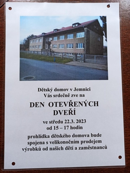 Dne 22.3. 2023 jsme uspořádali na našem hlavním pracovišti Den otevřených dveří. Podívat se do našeho dětského domova přišlo velké množství návštěvníků. Ze začátku jsme se hosty snažili počítat, ale pak jsme se v tak velkém počtu osob začali ztrácet, ale odhadujeme to na 250 - 300 lidí. Velké množství návštěvníků bylo přímo z Jemnice, ale i z blízkého i vzdálenějšího okolí. Každý žasl, jaké krásné a útulné prostředí naše děti mají. Hodně jsme slyšeli, že takové krásné a prostorné prostředí nemají ani děti ani v běžných rodinách. Hosté si také mohli zakoupit velikonoční výrobky od našich dětí a tet za symbolické ceny. Vážení hosté děkujeme za návštěvu a příští rok Vás pozveme do Budkova.