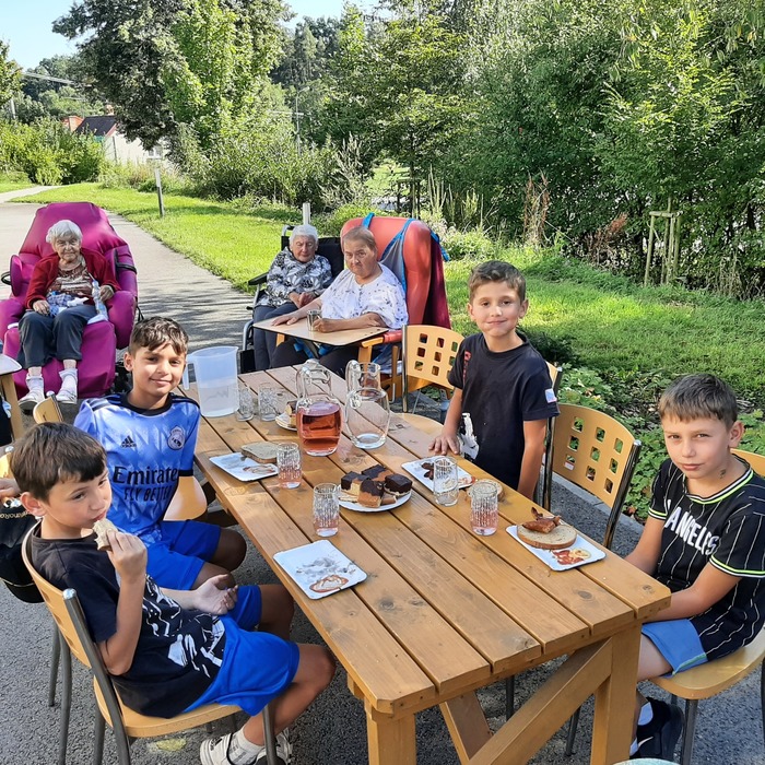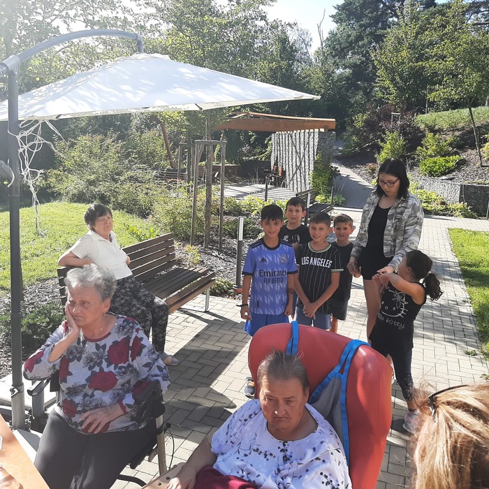 Dne 8. 9.2023 jsme přijali pozvání od seniorů z Dačic na opékání špekáčku. Po příjezdu jsme byli hezky přivítání pečovatelkami i samotnými seniory. Jako poděkování za pozvání jim děti předaly obrázky, které samy namalovaly. Každé z dětí dostalo opékací prut s napíchnutými špekáčky a pod dohledem vychovatelky si své špekáčky opekly a poté je s velkou chutí snědly. Dále jsme byli pohoštění upečeným moučníkem a dobrým nápojem. Na přání seniorů jsme si s nimi zazpívali lidové písničky a s komunikativnějšími seniory si povídali. Před našim odjezdem jsme byli provedeni po jejich zahradě, kde se děti měly možnost i proběhnout. Dle reakcí seniorů i dětí se odpoledne vydařilo a my se budeme těšit na další případnou návštěvu s nimi.