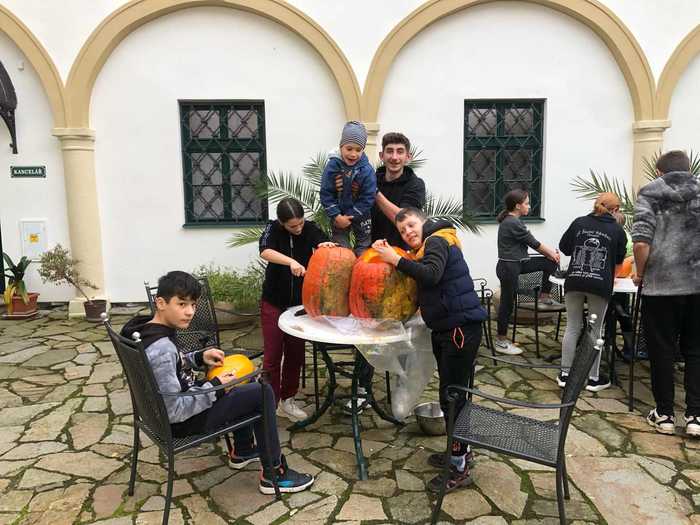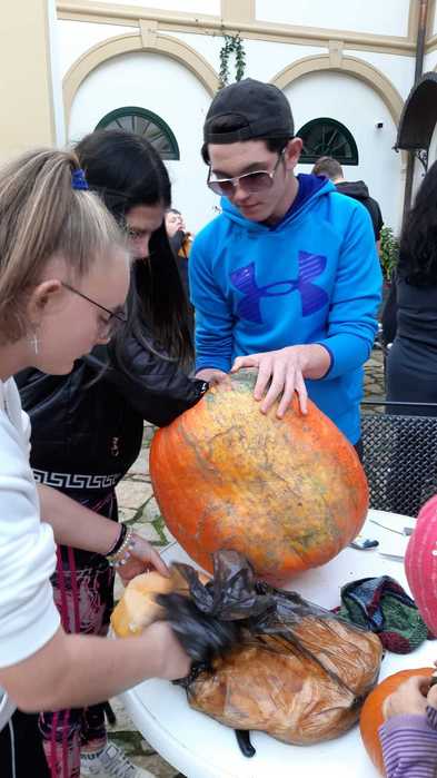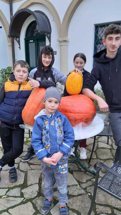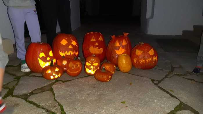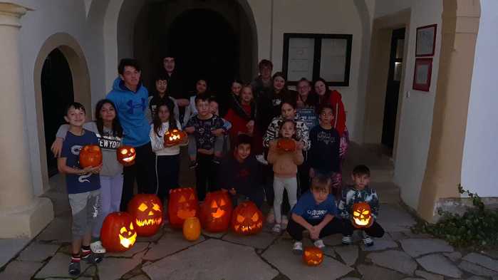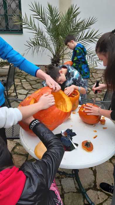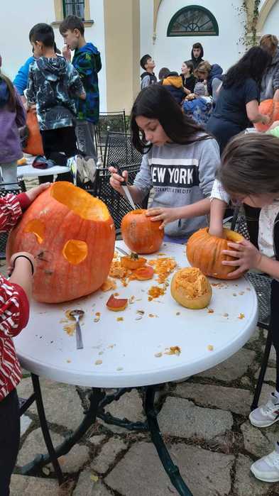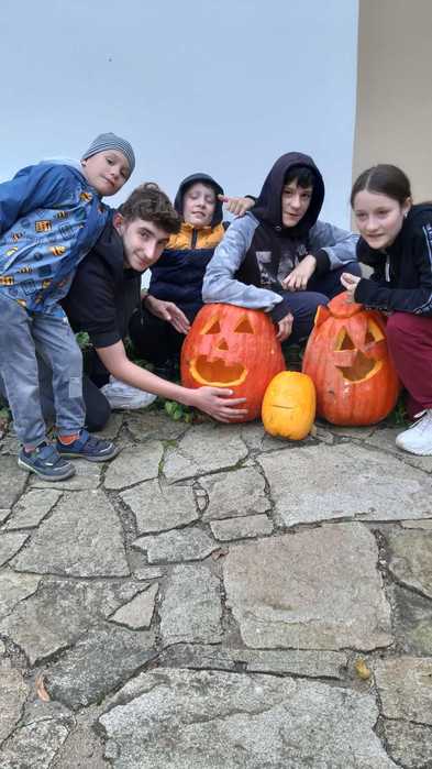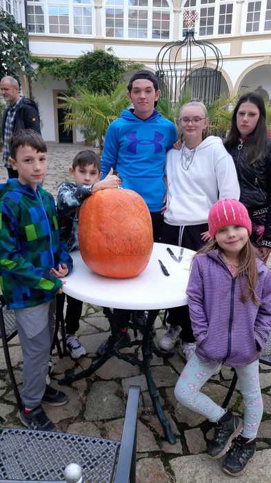 Výzdobu na blížící se Halloween můžeme vidět téměř na každém kroku. Rozhodli jsme se, že ani my nic nepodceníme a čtvrteční odpoledne jsme věnovali vydlabávání a vyřezávání dýní. Den k tomu byl jak stvořený. K práci nám svítilo to pravé podzimní sluníčko. Jedna skupina po druhé si vybírala velkou a několik malých dýní. Před samotnou prací byly děti poučeny o bezpečném zacházení s vyřezávacím náčiním. Potom už nikomu nic nebránilo ve vytváření uměleckých děl. Bylo milé pozorovat skupiny, jak v nich děti spolupracují, vzájemně si pomáhají, doplňují se, opravdu týmová práce. Během chvilky se pod rukama dětí rodily pozoruhodné výjevy. Někdo volil veselou tématiku, někdo naopak opravdu strašidelnou až děsivou. Když bylo dílo dokonáno, vše poklizeno, děti si své vydlabané dýně rozmístily po nádvoří a právem byly pyšné na svoji práci. Překvapením pro všechny bylo rozsvícení dýni večer, když už byla tma. Bez vědomí dětí totiž teta Simona doplnila do dýní světýlka a dodala tak dnešnímu tvoření tu pravou halloweenskou atmosféru. Výraz v dětských očích byl nepopsatelný. Ještě jednou bychom chtěli všichni touto cestou poděkovat dárcům dýní, bez kterých bychom si nemohli dnešní odpoledne tak báječně užít. DĚKUJEME.