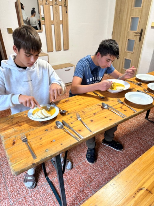 Dnes 8.10. 2023 pro nás připravila hostitelská rodina, pan Čaněk s paní Krejčovou, překvapení. Ráno jsme v rychlosti se nasnídali, umyli, oblékli a sbalili batůžky na cestu k hostitelské rodině. Z Grešlového Mýta jsme všichni jeli osobním vlakem do Znojma. Procházkou po Moravském městě jsme navštívili kostel sv. Mikuláše, kde jsme mohli obdivovat románskou stavbu a barokní kazatelnu v podobě zeměkoule. Z prostranství před kostelem jsme se chvíli zdrželi krásnou vyhlídkou po okolí a na údolí řeky Dyje, na rotundu sv. Kateřiny, znojemskou přehradu a část Znojemského hradu. Další naší zastávkou bylo muzeum v minoritském klášteře. Expozicí muzea bylo možné si prohlédnout orientální sbírku zbraní, převážně ty Asijské. V expozici je vystaveno více než 160 kusů zbraní. Po vstupu do nové expozice byla cca 22 m dlouhá otevřená vitrína, ve které byly prezentovány nálezy od prvních zemědělců, tzv. kultury s lineární keramikou, až po dobu římskou. Ve vitríně jsme prohlíželi vystavené četné originály doplněné zdařilými kopiemi, rekonstrukcí pece, žárového hrobu nebo hromadného nálezu bronzových předmětů. Každého pak zaujala figurína lučištníka kultury se zvoncovitými poháry z pozdní doby kamenné. V místním muzeu jsme strávili dost času na to, abychom si mohli vše v klidu projít a prohlédnout. Nakonec nastal čas k návratu zpět domů. Ze Znojma jsme se přemístili vlakem k hostitelské rodině, která nás pozvala k sobě domů do Grešlova Mýta na chutný oběd svíčkovou s houskovým knedlíkem, šlehačkou a brusinkami. Všem moc chutnalo a nikdo nenechal žádný zbytek. Hlavně ten dezert byl jedinečný, úplná tečka všeho pěkného. Ale protože čas kvapil, museli jsme už opravdu zpět domů do Jemnice, kde už se na nás všichni ostatní těšili a poslouchali zážitky, jak se nám na výletě líbilo.