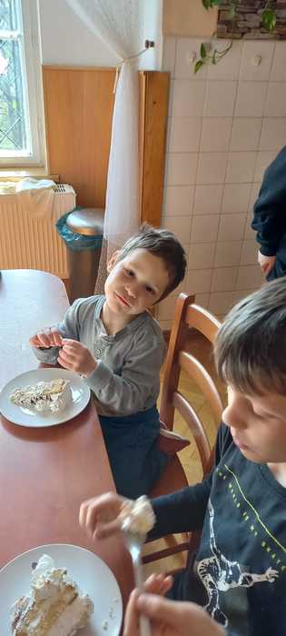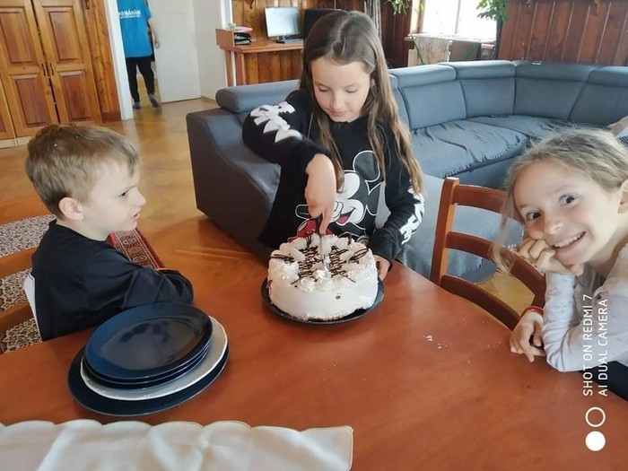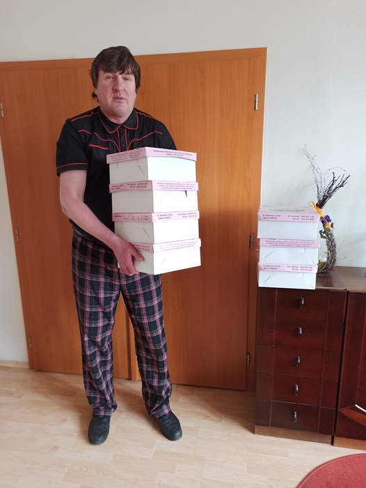 Dne 6.4. 2022 nám pan Kamínek z Dačic opět dovezl na rodinné skupiny celkem 7 kusů šlehačkových dortů. Každá rodinka dostala 1 dort, o který se děti spravedlivě podělily. Pan Kamínek dětem dorty vozí s železnou pravidelností a už bychom asi ani nespočítali, kolik jich děti za ty roky spořádaly. Pan Kamínek naše děti doslova rozmazluje již dlouhé roky i různými dárky a proto dětem ještě dovezl hrací kostky. Pane Kamínku, velmi Vám za dorty a celkovou podporu děkujeme!!!
