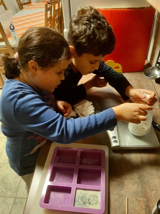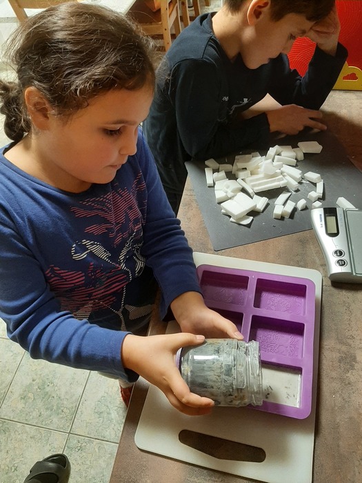 V uplynulých dnech jsme se s dětmi bavili výrobou svíček z palmového vosku a glycerinových mýdel. Děti pod dohledem navažovaly vosk, který jsme nechali rozpustit ve vodní lázni. Během rozehřívání vosku děti do forem připevnily knoty a rozehřátý vosk teta vychovatelka do forem nalila. Pak už jsme jen čekali a děti se těšily, až vosk v lednici zatuhne, aby mohly svíčku z formy vytáhnout a potěšit se pohledem na svíčku se vzorem andělských křídel. Jako další výrobek jsme si zvolili výrobu glycerinových mýdel. Zde děti odvažovaly glycerinovou hmotu, obarvovaly ji aktivním uhlím a suchými květy levandule. Pod dohledem děti hmotu nalily do silikonové formy a poté už s netrpělivostí čekaly, až ztuhlé mýdlo vyjmou a potěší se krásnými vzory. Těmito a dalšími výrobky, které naše děti vyrobily, jsme prezentovali náš domov u sponzorů a přátel našeho dětského domova.