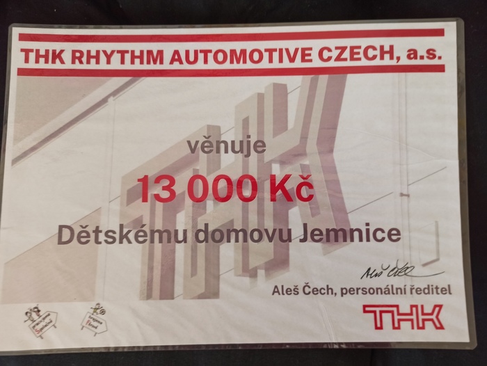 Dne 24.10. 2022 se paní ředitelka se třemi dětmi zúčastnila slavnostního předání šeku s částkou 13.000,- Kč v prostorách společnosti THK Rhythm Automotive Czech a.s.. Od jara 2022 zaměstnanci této společnosti sbírali během běhu, chůze a jízdy na kole kilometry v rámci projektu „Zdravý pohyb“. Cílem bylo podpořit vzdělávací instituce v okolí Dačic. Náš dětský domov získal 1. místo. Peníze použijeme na letní dětské tábory a volnočasové aktivity našich dětí. Velmi všem zaměstnancům děkujeme, vážíme si všech, kteří jsou ochotni obětovat svůj volný čas pro druhého. Z celého srdce děkujeme!